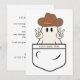 Envía diversión espeluznante con nuestra tarjeta de Halloween Pocket Theme Western Boo Cowboy Fun. Con un diseño divertido de un fantasma vaquero asomándose desde un bolsillo, esta tarjeta es perfecta para agregar un toque de encanto western a tus saludos de Halloween. Ideal para amigos, familiares o invitaciones a fiestas, es una forma única de celebrar la temporada.