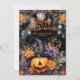 Hermosa tarjeta de Halloween con una linterna jack-o’lantern usando un gorra negro de brujas y flores moradas y naranjas. Personaliza fácilmente esta tarjeta de Halloween con tu nombre y texto familiar.