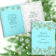 Tarjetas de Navidades cristianos con escritura del libro de Isaías. "Porque para nosotros nace un niño, para nosotros se nos da un hijo" está al frente con el resto del verso dentro de la carta, "y el gobierno estará sobre sus hombros y se le llamará: "Maravilloso Consejero, Dios Todopoderoso, Padre Everaz, Príncipe de la Paz". También utilice la plantilla de texto para agregar un mensaje (o utilice el ejemplo) con una firma. Azul con diseño de copos de nieve dorados.