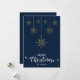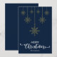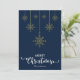 Azul oscuro Feliz Navidad con sofisticados guiones decorativos y el diseño de copos de nieve dorados colgantes. Esta tarjeta de Navidades de color de fondo azul está diseñada para que pueda cambiar el color del fondo. También puede introducir el nombre de su familia o eliminarlo si desea tener el diseño sin el texto. También puede personalizar el color de las palabras "Feliz Navidad" editando este diseño si lo desea.