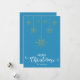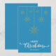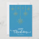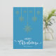 Blue Merry Christmas con un guión decorativo elegante y el diseño de copos de nieve dorados colgados. Esta tarjeta de Navidades de color de fondo azul está diseñada para que pueda cambiar el color del fondo. También puede introducir el nombre de su familia o eliminarlo si desea tener el diseño sin el texto. También puede personalizar el color de las palabras "Feliz Navidad" editando este diseño si lo desea.