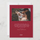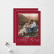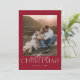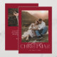 Esta tarjeta de fotos de Navidad presenta un diseño moderno pero festivo con una sola foto destacada en el frente. El fondo es de un color rojo intenso. Centrado encima o debajo de la foto, el texto "Feliz Navidad" se muestra con un elegante y moderno tipo de letra en blanco, lo que proporciona un sorprendente contraste contra el fondo verde. La sencillez del diseño de una sola foto permite que la imagen ocupe el centro del escenario, lo que la convierte en perfecta para un retrato familiar o un momento especial a partir del año. En la parte trasera de la tarjeta hay otra foto, que ofrece la oportunidad de compartir una memoria sincera o adicional. Debajo de la foto, hay espacio para un mensaje personalizado, que le permite incluir un sincero saludo de vacaciones, expresar gratitud o compartir sus deseos para el próximo año. El mensaje puede ser personalizado para incluir el nombre de la familia y el año, manteniendo el diseño cohesivo y personal.