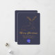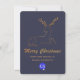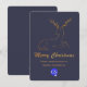 Elegante tarjeta de bienvenida de Navidades de color azul oscuro de pizarra azul oscuro, con un purpurina dorado que parece ciervo estilizado, en la mitad superior de la tarjeta. Purpurina dorado luce texto gráfico leyendo Feliz Navidad, decora la mitad inferior de la tarjeta Tan personalizado texto listo para personalizar con el nombre de su empresa y un área de logotipo está lista para reemplazarlo con el logo de su empresa.