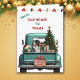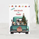 Una verde azulada camioneta azul lleva un árbol de vacaciones decorado y paquetes de regalo delante de esta bonita tarjeta de Navidades. Un hermoso perro de montaña de Bernese da al portón trasero. Un cartel rústico de madera en el parachoque trasero dice "Navidades Cheer". En la parte superior de la tarjeta hay una cadena de luces navideñas y texto personalizado que actualmente dice "De nuestra casa a la tuya". El interior de la tarjeta tiene más campos de texto para que el personalizar sea posible.