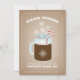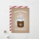 Una tarjeta de Navidad con un ilustracion de un frasco de chocolate caliente adornado con un bastón de caramelo y copos de nieve. El fondo de la parte delantera está inspirado en el stock de cartas. El fondo de la marcha atrás son las rayas de caramelo rojas y blancas. Personalice el texto.