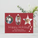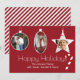 Festividad de Navidades de fotografía personalizados rojos tarjetas de felicitación hechas en estilo plano, con tres áreas de imagen enmarcadas en blanco en forma de adornos. Un divertido bastón de caramelo rojo y blanco parece colgar del saludo de Feliz Navidad. Personalice con sus imágenes y texto.
