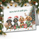 Cuatro tiernos de color agua adorables Dachshund Dogs usan su atuendo navideño y se sientan con paquetes de regalo en la parte delantera de esta tarjeta de Navidades. Tres de ellos usan sombreros de Santa, rojos y blancos, y uno lleva corbatas. El texto de arriba dice "Estamos aquí para desearle...", y el sentimiento continúa en su interior. El texto es todo personalizable, así que puedes hacer que diga lo que quieras. Ver más imágenes y productos de perros y gatos en Dog Village.