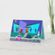 Esta tarjeta de Navidades del Personalizado de vacaciones de Personalizable retro le pondrá en el espíritu de las vacaciones. El diseño de esta casa moderna de mediados de siglo es exterior. A través de las paredes de cristal color turquesa del suelo al techo se pueden ver las siluetas azul marino de los fiestas festivos. Hay una pareja conversando frente a un árbol de Navidad verde, decorado con adornos verde azulados. En el lado opuesto de la sala, se ve a un bailarín y al hombre de larga trayectoria que todos intentan evitar. El exterior de la casa cuenta con una alegre puerta roja con una corona de feriado, una chimenea de ladrillo violeta de gran tamaño y varias lámparas de Navidad coloridas. Una pasarela gris está cortando una franja hacia la puerta principal, a través del césped verde azulado. La escena nocturna tiene un cielo azul oscuro con una luna amarilla y creciente. El muñeco de nieve de plástico que decora el patio delantero es recibido por las primeras ráfagas de nieve de la temporada. Una pareja atractiva está haciendo la cha-cha-cha en el camino a su auto. La rubia lleva puesto un vestido rojo brillante. Ella está sosteniendo un brote de mistletoe en una mano. Su guapa escolta lleva puesto un traje negro y una corbata roja. Sus manos están envueltas alrededor de la cintura de la mujer. En la calle, frente a la casa, podemos ver tres coches clásicos de colores vivos. El interior de la tarjeta contiene dos estrellas amarillas que rodean las palabras "Felices Fiestas", pero puedes personalizar la tarjeta como quieras. ¡Pida hoy y fiesta como si fuera 1959!