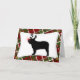 La tarjeta de Navidades de Bulldog francés es divertida y tiene una silueta de raza de perro, con renos y una nariz brillante y roja. El fondo es una alegre estancia llena de rojos y verdes. En el interior se puede leer: "¡Les deseo a ustedes y a su familia una maravillosa temporada de vacaciones!" Personaliza el mensaje a tu propia facilidad. Cute tarjetas de Navidades amantes de los perros.