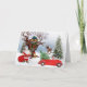 Tarjeta de Navidades de Santa Claus con auto rojo que lleva árbol de Navidad, zorro de invierno, reno.