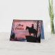 Personalice este exclusivo "One Of A Kind" Vaquero Y Navidades De Caballos y tarjeta de vacaciones! Cuenta con un Vaquero sentado en su caballo viendo a distancia un alce de toro durante un hermoso atardecer de coral y azul... ¡Rodeado de fronteras negras! Diseño De Arte Original Por El Artista Kerry Miller!