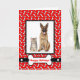 La tarjeta encantadora incluye tu foto mascota favorita o la foto familiar. Patrón de hueso de perro rojo alrededor de un marco de plantilla de foto.