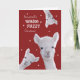 Esta tarjeta de Navidades humorísticos incluye tres llamas blancas borrosas que cuelgan desde todos los ángulos y direcciones con diminutos copos de nieve blancos sobre un fondo rojo audaz. Delante de la carta hay un cálido y difuso saludo de vacaciones con una letra divertida.