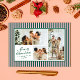 Pequeñas franjas verticales rosas y verdes oscuras le dan a esta tarjeta de vacaciones de tres fotos un ambiente moderno y de moda cuando se combina con fuentes clásicas en verde bosque. El patrocinador coordinado presenta un mensaje personalizado más largo de alegría y actualización para el año que es perfecto para enviarlo a amigos y familiares.