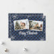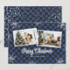 Tarjeta de Navidades de fotografía de manta de búfalo azul y plata personalizado con copos de nieve y dos fotos contra un patrón de manto azul de búfalo. Personaliza fácilmente esta tarjeta de Navidades de fotos de copos de nieve con tus fotos y un nombre de familia.