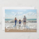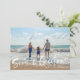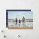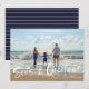 Tarjeta de saludo de navidades en un diseño fotográfico inspirado en la playa "Seas & Greetings" (Mares y saludos). Personalizado con tu foto y el nombre de tu familia. Esta tarjeta de Navidades de playa se transforma en una franja náutica azul y blanca en la parte trasera.