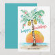 La tarjeta de Navidades planos, temática tropical de playa, cuenta con una isla al sol con una palmera decorada con lámparas de cuerda y adornos y un saludo de "felices fiestas". Arte por KL Stock