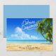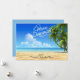 Deseos cálidos desde la playa. En una escritura blanca se dice, "Feliz Navidad". Hay un cielo azul brillante con palmeras a lo largo del costado saliendo. El océano, de aguas cristalinas, se está estrellando a lo largo de la arena. Echa un vistazo a las muchas otras escenas y productos de la playa que tenemos en nuestra tienda.