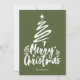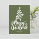 Feliz Navidad con un estilo decorativo de escritura tipo fuente con un contorno de un árbol de Navidad y estrella en diseño superior. Esta tarjeta de Navidades de color verde oliva oscuro está diseñada para que pueda cambiar el color de fondo, los gráficos y también introducir su nombre familiar.