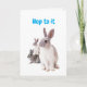Esta tarjeta de Pascua tiene tres conejillos en el medio de la carta. El texto azul del cielo delantero dice "Salta a él". En el interior se puede leer "¡Y tengan una Pascua feliz!". En el interior a la izquierda está el color azul cielo. El texto es azul cielo sobre blanco. Personalizar esta tarjeta o compra como está.
