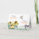 En la parte delantera de esta tarjeta Happy Easter and Happy Spring (Pascua feliz) hay acuarelas con flores de oro, crocus púrpura, hierba y un pato amarillo. Arriba vuela un pájaro pequeño, y el texto estilizado dice 'Feliz Pascua" y "Feliz Primavera". El interior de la tarjeta tiene otra imagen de un pájaro y dos campos de texto para su propio mensaje y firma. ¡Alegre!