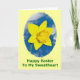 Fotografía del primer del narciso amarillo casi perfecto silueteado contra un cielo azul con las nubes blancas, amarillo enmarañado. Esta imagen y diseño se utiliza para crear un amor, una tarjeta de felicitación de papel feliz romántica de Pascua para la novia, un novio, un amante, o a un amor.