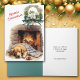 La parte delantera de esta tarjeta de saludo de los Navidades tiene una linda imagen de un Perro Golden Retriever dormido frente a una chimenea encendida. El perro es acogedor bajo su manta, y tiene una taza de cacao y una galleta preparadas para la aparición de Santa. El texto rojo de arriba a la izquierda dice "Feliz Navidad". El texto es personalizable, como lo es todo el texto interno, así que puedes hacer que diga lo que quieras. Vea más imágenes de Golden Retriever, junto con docenas de otros productos de raza de perros, en Dog Village.