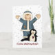 Encantadores Navidades saludando tarjetas con primitivas gráficas de estilo rural de un niño jugando en la nieve con un pingüino. Saludar por dentro y por fuera está listo para personalizar para leer lo que quieras.