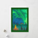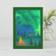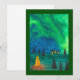 Tarjeta de saludo con pintura mixta de vacaciones. Aurora boreal y fuego de fuego.