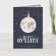 La paz en la Tierra acuarela mundo ornamento, rústica tarjeta de vacaciones color azul medianoche. Características de la tarjeta, caída de acentos de nieve, ornamento de acuarela y letras festivas. La plantilla proporciona varias líneas para el nombre, mensaje, año y 3 espacios de fotos dentro de la tarjeta.