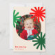 Este bonito y divertido diseño de tarjetas de vacaciones cuenta con formas de pompom/star/copo de nieve estilizadas y coloridas que enmarcan una foto redonda y texto que dice "Be Merry" en rojo brillante sobre un fondo crema. La foto, el nombre y el saludo se pueden personalizar fácilmente para un toque personal. También disponible como descarga de tarjeta de Navidades digitales.