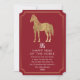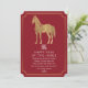 ¡Celebremos el año del caballo con gracia y estilo! Estas tarjetas de Año Nuevo chinas presentan un majestuoso caballo en oro fijado en un audaz fondo rojo, que simboliza la fuerza y la prosperidad. Perfecto para compartir sus deseos de suerte y éxito. ¡Envíen un toque de elegancia este Año Nuevo Lunar! Tenga en cuenta que el oro de este producto NO es un Relieve metalizado real; se imprime sin formato.