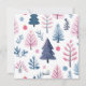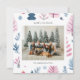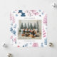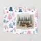 Tarjeta de vacaciones con ilustraciones de árboles de Navidad lindos en un esquema de colores pastel con una foto familiar emparejada con un saludo de vacaciones y su nombre y año en una fuente sans serif.