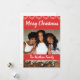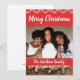 Tarjeta de vacaciones para familia afroamericana. Agrega tu propia foto familiar. Hermosa foto y fondo rojo con ramas blancas nevadas y adornos de hielo.
