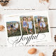 Plantilla de tarjeta de vacaciones minimalista y moderna con 3 fotos y un texto en escritura que dice "alegre" en la parte inferior. También puedes agregar otra imagen y mensaje en la parte trasera.