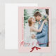Esta tarjeta de Navidad para recién casados es clásica y simple, pero aún así caprichosa. Comparte tu foto de boda de la novia y el novio con amigos y familiares en este diseño que presenta las palabras "Alegre y Casada" en una caligrafía con acento de una fuente serif. Tu foto de boda está acentuada por un lazo rojo de acuarela pintado a mano para agregar un toque femenino de vacaciones.