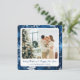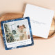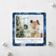Celebra la temporada con estilo con esta elegante tarjeta de vacaciones de copo de nieve azul que presenta esquinas redondeadas suaves y una disposición de fotos personalizable. El fondo azul marino rico está acentuado con delicados copos de nieve que caen y detalles de bokeh ligero, creando una atmósfera festiva y invernal que enmarca hermosamente la foto de vacaciones de tu familia.