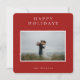 Elegante y sencilla tarjeta de foto de "Felices Fiestas" con estrellas blancas sobre rojo festivo.