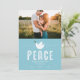 Esta única tarjeta de festividad fotográfica ofrece espacio para una foto en la parte superior. Debajo de la foto hay un ilustracion de una paloma sobre la palabra paz. También hay espacio para un saludo, tu nombre y el año.