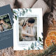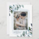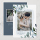 Elegantes tarjetas de fotos de vacaciones con tu foto vertical favorita enmarcada por un marco de color azul claro y helado. Las hojas y el follaje de las acuarelas verdes y azules adornan los bordes de la tarjeta de Navidades única. Personalice la parte delantera de la tarjeta agregando un saludo personalizado (mostrado con "Feliz Navidad"), su nombre y el año con letras azul oscuro. La tarjeta se revierte para mostrar un fondo azul oscuro sólido con un marcador de posición para una foto adicional y el mensaje personalizado que se muestra debajo en texto blanco. El diseño se coordina con nuestra colección de tarjetas de Navidades del Foliage de Invierno Moderno.