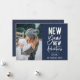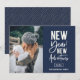 New Year New Adventures, tarjeta de foto de vacaciones. Presenta una tipografía moderna de moda blanca sobre azul marino con una base de color azul marino y geométrica dorada.