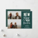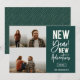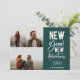 New Year New Adventures, tarjeta de collage de fotos del New Year's Holiday 3. Presenta una tipografía moderna de moda blanca sobre el verde cazador con un respaldo de patrón geométrico de color verde y oro coordinado.