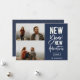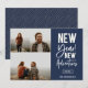 New Year New Adventures, tarjeta de collage de fotos del New Year's Holiday 3. Presenta una tipografía moderna en blanco moda sobre azul marino con un respaldo de patrón geométrico oro coordinado.