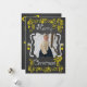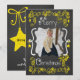 Un fondo de pizarra con hermosos rollos de texto amarillo y blanco que dice "Feliz Navidad" delante y "Que todos tus días sean alegres y brillantes" detrás. Esta hermosa tarjeta personalizada de fotos navideñas de vacaciones tiene varios adornos estelares, y un pájaro en un diseño de nido y áreas que puedes fácilmente agregar tus nombres, el año actual, y foto!