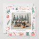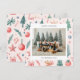 Tarjeta de vacaciones con bonitos ilustraciones temáticos de Navidades en una combinación de colores pastel con una foto familiar acompañada de un saludo de vacaciones y tu nombre y año en una fuente sans serif.