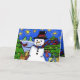 La tarjeta de vacaciones de jardín de cardenal y muñeco de nieve está llena de diversión navideña. El cardenal está feliz de ver a sus amigos recién hechos de nieve. Los paquetes y árboles navideños rodean a la pareja mientras brillantes estrellas llenan el cielo. Ideal para amigos y familiares y cualquiera que ame los cardenales, muñecos de nieve, jardines y la naturaleza. ¡Felices Fiestas! Diseño original de Jan DeAngelis