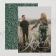 Envía alegres saludos de vacaciones a amigos y familia con estas elegantes tarjetas de fotos de Navidad. El diseño presenta tu foto vertical favorita de sangre completa con "Joyful" en un sobreimpresión de escritura de caligrafía moderna y blanca. Personalice la tarjeta agregando su apellido y el año. La tarjeta se invierte para mostrar un patrón follaje blanco contra un fondo verde oscuro personalizable. Las simples tarjetas de Navidad seguramente impresionarán a todos en su lista de Navidades esta temporada de vacaciones.