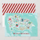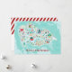 Mapa de pueblo del Polo Norte ilustrado con dibujos animados, tarjeta de Navidad. La tarjeta presenta edificios coloridos, elfos, Papá Noel, renos y trineo en el Polo Norte con un diseño de estilo de mapa. La parte trasera de la tarjeta proporciona líneas para su mensaje personalizado, nombres y año con un detalle patrón de rayas de bastón de caramelo festivo.