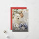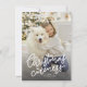 "Navidades Cortesía" con la mano escrita en blanco contra tu adorable foto mascota y rayada roja hacia atrás con un lugar para el texto personalizado