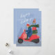 Esta caprichosa tarjeta de vacaciones sin foto presenta una ilustración dibujada a mano de una mujer conduciendo un scooter lleno de regalos y tiene un lugar para incluir una foto familiar y un mensaje en el reverso.